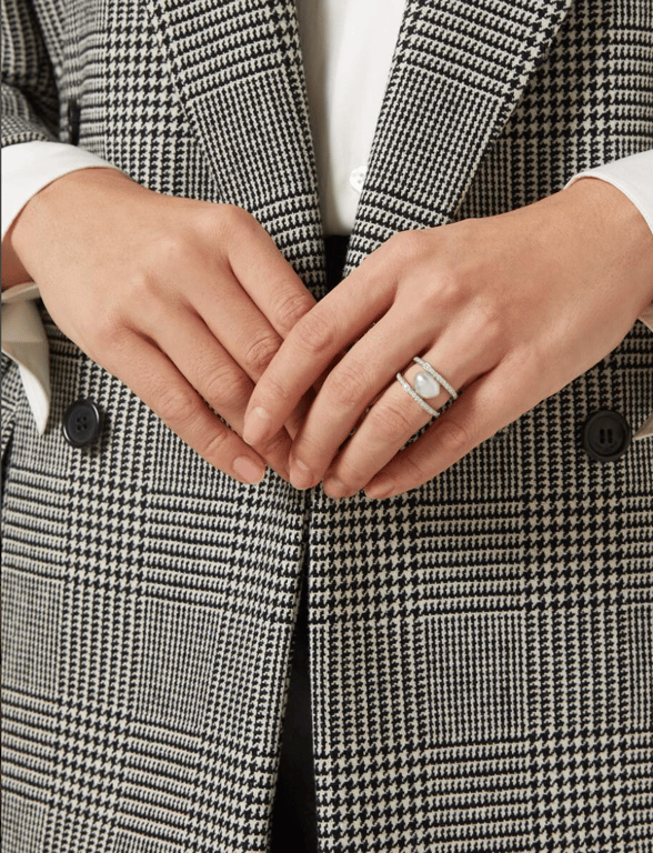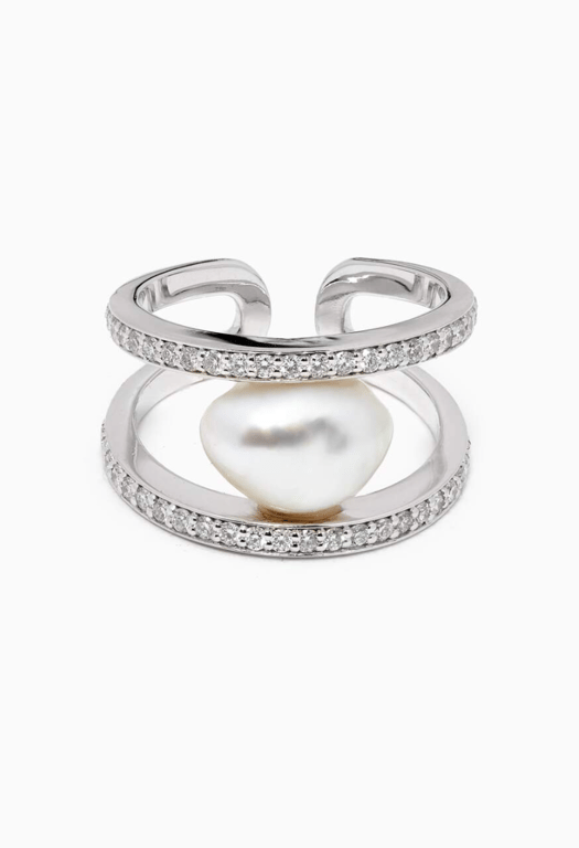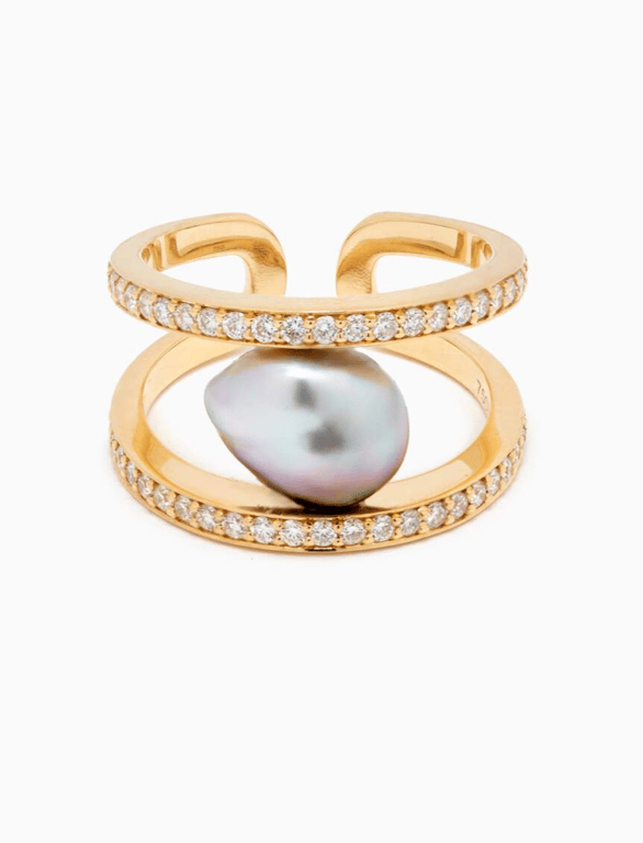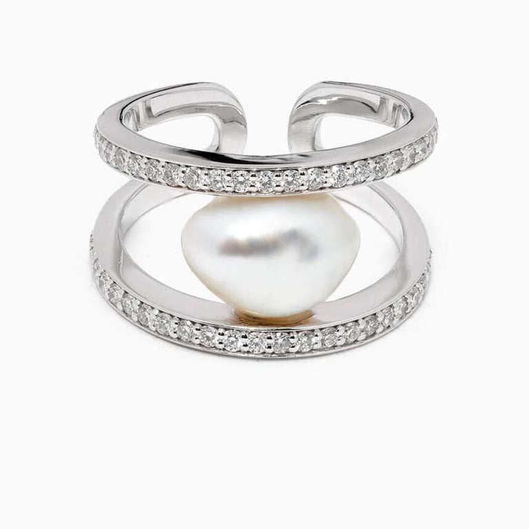 The "Tahitian Pearl Loop Ring" is a stunning celebration of nature's beauty, featuring a Keshi pearl nestled within a loop of diamond-set 18kt gold. This elegant design offers an enduring appeal, making it a sophisticated addition to any jewelry connoisseur's collection.