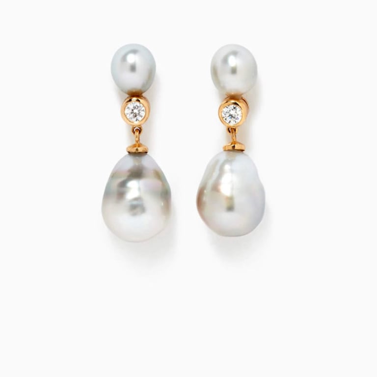 Grace your ears with the "Tahitian Baroque Pearl Earrings," where lustrous pearls and glossy gold meet sparkling brilliant-cut diamonds. These earrings exude opulence, perfect for showcasing with an updo that commands attention.